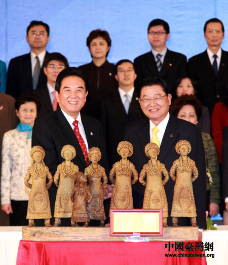 12月21日下午,海協會會長陳云林與海基會董事長江丙坤正式簽署《海峽兩岸醫藥衛生合作協議》,雙方并在協議簽署后互贈禮品。圖為海協會致贈海基會方面的雕塑作品《好事連連》。(中國臺灣網 鐘寶華 攝)