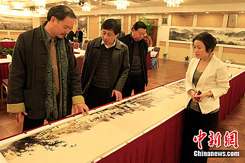 4月1日,臺灣著名畫家許文融(左一)在上海介紹其創作的320米水墨畫《臺灣風物圖長卷》。其真跡將于4月22日在上海美術館公展,屆時將揭開紀念辛亥革命100周年滬臺文化交流活動序幕。《臺灣風物圖長卷》再現了寶島自然山川、人文建設和信仰民俗。中新社發 潘索菲 攝
