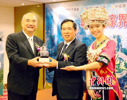 張家界在臺北舉行旅游推介會。圖為張家界市委常委、宣傳部長肖凌之(中)向臺灣旅游業者贈送紀念品。路梅 攝