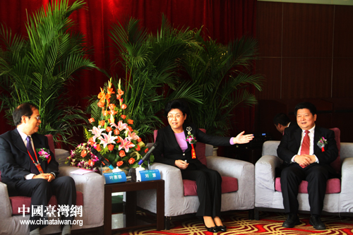寧夏回族自治區(qū)政府副主席劉慧、國務(wù)院臺灣事務(wù)辦公室主任助理龍明彪等21日下午在銀川會見了前來參加第六屆寧臺經(jīng)貿(mào)合作洽談會的臺商代表。(中國臺灣網(wǎng) 楊麗 攝)