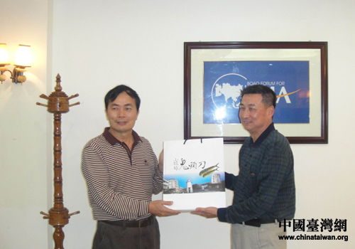 海南省瓊海市委常委文明光與臺灣屏東縣琉球區漁會總干事蔡寶興互贈紀念品。(圖片來源:海南省臺辦)