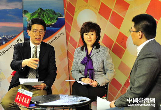 資深臺(tái)灣問題專家中國社會(huì)科學(xué)院臺(tái)灣研究所副所長謝郁(左二)和北京聯(lián)合大學(xué)臺(tái)灣研究院劉紅教授(左一)在接受本網(wǎng)視頻專訪。(中國臺(tái)灣網(wǎng) 劉海偉 攝)