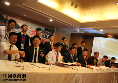 交流團團長、副團長及臺灣文化、經貿和旅游界嘉賓見證簽約。(安順臺辦 黃凱 攝)