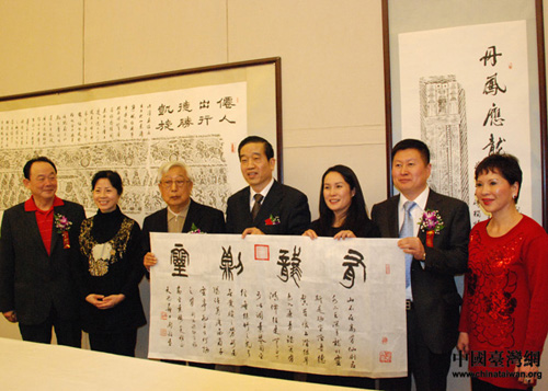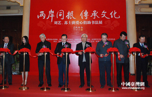 中國臺灣網3月28日北京消息 由全國政協書畫室、中國書畫收藏家協會主辦的“兩岸同根,傳承文化——劉藝、蘇士澍愛心捐助書法展”昨日上午在全國政協禮堂隆重舉行;顒庸舱钩鰟⑺、蘇士澍兩位當代著名書法家作品80余幅。同時,兩位名家還當場向臺灣省花蓮縣秀林鄉捐贈人民幣300萬元籌建“愛心圖書館”。原全國政協副主席、政協書畫室主任張思卿,海峽兩岸關系協會副會長王在希,臺灣地區少數民族民意代表高金素梅等出席活動。