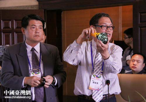 郭光華說,1932年,日本人在花蓮縣發現石棉礦,由于石棉是隔熱、斷熱最好的材料,可做為日本二次大戰期間軍事工業用途,因此日本人大量開采石棉,而與石棉共生的豐田玉則被當作廢石傾倒于河谷之中。直到1961年左右,臺灣地質界廖學誠與譚立平教授等人實地考察與研究,在礦區河床與石棉坑道口的廢石區中發現,這些廢石竟是價值連城的閃玉。經過精心的制作與推廣,在1962年至1986年間,臺灣所生產的閃玉為世界第一約占全球總量的60%,從而創造了臺灣經濟奇跡。郭光華拿出自己從臺灣帶來的貓眼石項鏈、羊脂玉手鐲、墨玉茶具等一系列的玉石制品,并詳細介紹了其開采、制作、推廣的經驗。