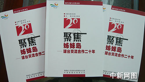 為紀念海南建省辦經濟特區20年,感謝致力瓊臺兩島交流合作的兩岸有識之士,海南省臺辦、中新社海南分社聯合編著《聚焦姊妹島——瓊臺交流合作20年》一書。該書以新聞報道的形式,詳實、生動地再現了瓊臺交流的歷程和重大歷史事件,反映了20年來瓊臺交流合作取得的重要成果。