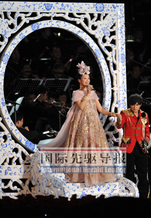 引發(fā)兩岸媒體和網(wǎng)友熱評(píng)的“英倫組合”在臺(tái)灣并不是人盡皆知。圖為今年6月30日,宋祖英、周杰倫在北京國(guó)家體育場(chǎng)“鳥巢”合唱《千里之外》。本報(bào)記者 金良快/攝