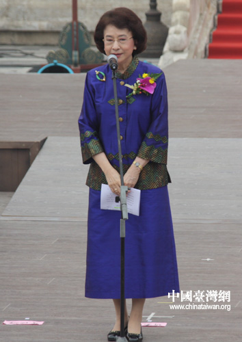 林澄枝致辭時除了替未到場的臺灣“文化總會”會長劉兆玄表達祝賀活動圓滿成功,她并表示,自己站在這里非常激動,因為剛才“許委員長(許嘉璐)把我們中華兒女內心的深沉感覺全部激發了出來”。為了與開幕式開始時孩子們吟唱的《詩經》回應,林澄枝還用閩南語演唱了《風橋夜泊》這首古詩,得到現場一陣掌聲。