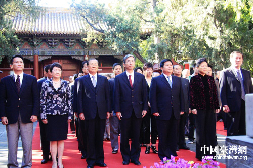 國臺辦主任助理龍明彪(右三)、北京市政協副主席蔡國雄(中)、中國國民黨中評會主席團主席饒穎奇及夫人(左二、三)等嘉賓出席祭孔大典。(中國臺灣網 馬迪 攝)