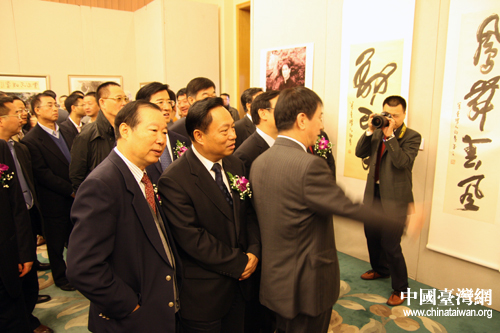 參加開幕式的嘉賓在樓柏安的陪同下參觀畫展中的書畫精品。(中國臺(tái)灣網(wǎng) 蕪?fù)?攝)