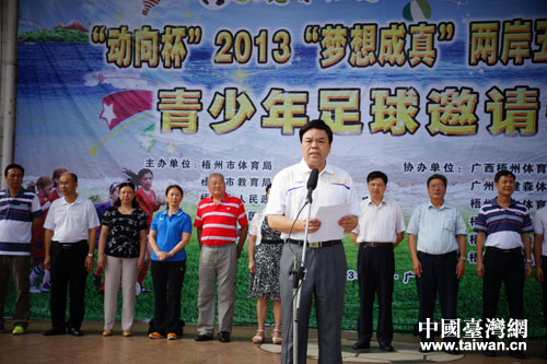 中國臺灣網7月19日梧州消息 7月18日,廣西梧州市體育局、教育局、臺辦、僑聯和夢想成真體育俱樂部主辦的“動向杯”2013“夢想成真”兩岸五地(梧州)青少年足球邀請賽在梧州市體育訓練基地隆重開幕。