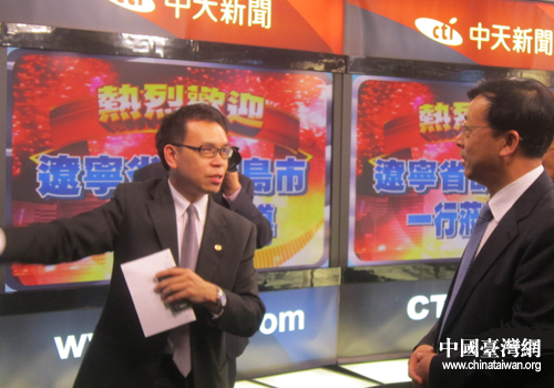 中天電視臺工作人員為白雪峰團長一行介紹企業情況。(圖片來源:葫蘆島市臺辦)