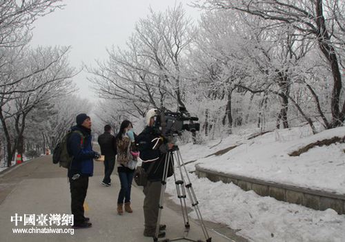 攝制組一行先后在玉女峰、水簾洞、毛公碑等核心景點及花果山大道等地進行采訪拍攝。攝制組登上山頂時,恰逢霧凇景觀,整個山頂的樹林像是披上了薄薄的銀裝,引得攝影記者久久不愿離開。臺灣記者們還格外關注一個問題“孫悟空的老家在哪個花果山”,并最終在著名景點——毛公碑找到了答案,連忙拍下碑文內容:孫猴子的老家在新海連市云臺山——毛澤東。