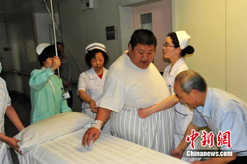 41歲的張峰是陜西省榆林市府谷縣一名普通工人,樂觀,開朗。從25年前就開始體重增加,飯量增大,每天光主食就能吃1公斤。曾于2006年、2010年先后兩次入院進行治療。但由種種原因,體重又反彈,今年3月初再次入院時,體重已增至229公斤,坐時腹圍達到2米,并出現了意識模糊、嗜睡、浮腫、四肢末梢皮膚發紫等癥狀。
