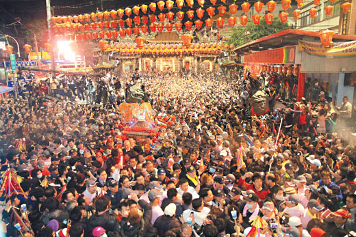 昨晚11時5分,大甲鎮(zhèn)萬頭攢動,信眾跟在媽祖神轎后,展開繞境之旅。(圖片來源:臺灣《聯(lián)合報》)