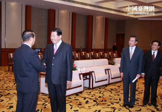 11月7日晚,中共中央政治局常委、全國政協(xié)主席賈慶林在寧波會見率團出席兩岸農漁水利合作交流會的親民黨主席宋楚瑜一行。(中國臺灣網(wǎng) 鐘寶華 攝)