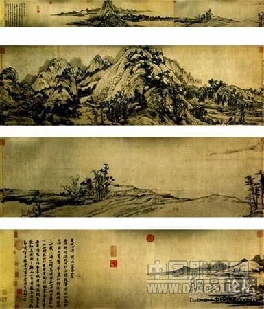 《富春山居圖》,縱33厘米,橫636.9厘米,紙本,水墨。始畫于至正七年(1347),于至正十年完成。此圖歷經千年,為世人留下諸多感人故事。據載,清初時收藏此畫的收藏家吳問卿在彌留之際欲將其火殉,被其侄從火中搶出,獨裝裱,人稱“剩山圖”,現為浙江省博物館收藏。另外一大段則一直深藏于清宮中,后被運往臺灣。諸多年來,兩岸畫家和有識之士多方努力,希望有朝一日能夠“破鏡重圓”,重新拼合此畫。