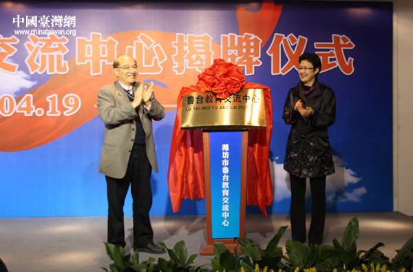 2010年4月19日晚間,魯臺教育交流中心在山東省濰坊市正式成立,濰坊市副市長王桂英和臺灣海峽兩岸教育交流促進會理事長李超群共同為該中心揭牌。(中國臺灣網 楊永青 攝)