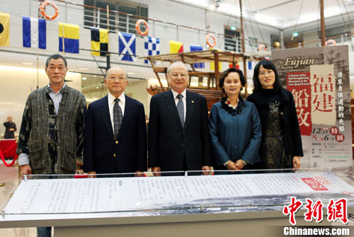 12月22日,“福建船政——清末自強(qiáng)運(yùn)動(dòng)的先驅(qū)”特展在臺(tái)北開(kāi)幕。70多件文物及展品和百余幀珍貴圖片,展現(xiàn)中國(guó)近代奮發(fā)圖強(qiáng),尤其是船政沿革和海軍建設(shè)等的成就和歷程。圖為福建船政創(chuàng)辦者沈葆楨后人沈呂遂、臺(tái)灣前海軍總司令葉昌桐、長(zhǎng)榮集團(tuán)副總裁林省三、福州政協(xié)副主席陳今明(左起)等為特展開(kāi)幕剪彩后合影。 中新網(wǎng)發(fā) 黃少華 攝
