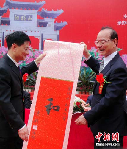 4月21日,一幅由國民黨榮譽主席連戰(zhàn)題寫的“和”字,由國民黨副主席林豐正(右)代其贈給湖南陽明山,并將永久藏于陽明山“和”字館。中新社發(fā) 傅煜 攝