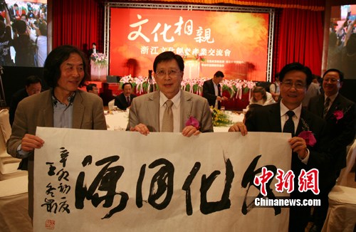 26日下午,浙江與臺灣有關方面共同主辦的2011·文化相親”—文化創(chuàng)意產(chǎn)業(yè)交流會在臺北圓山飯店舉行。圖為:浙江省委書記趙洪祝(右一)將杭州著名書法家王冬齡(左一)現(xiàn)場書寫的一幅《文化同源》草書贈與臺灣中華文化總會會長劉兆玄(中間)。 嚴格 攝