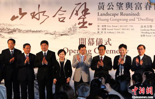 “山水合璧—黃公望與富春山居圖特展”6月1日上午在臺北故宮舉行開幕儀式。浙江省委書記趙洪祝、國家文物局局長單霽翔、臺灣中華文化總會會長劉兆玄、臺北故宮博物院院長周功鑫等出席。中新社發(fā) 趙振清 攝