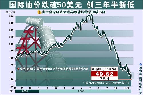 由于經(jīng)濟(jì)衰退導(dǎo)致能源需求持續(xù)下降,國際油價(jià)上周累計(jì)下跌約12%,紐約市場油價(jià)更是跌破了每桶50美元,上周五紐約商交所一月輕質(zhì)原油期貨結(jié)算價(jià)報(bào)收于每桶49.93美元。從7月11日創(chuàng)下每桶147.27美元的歷史最高記錄以來,國際油價(jià)已經(jīng)累計(jì)下跌六成多。