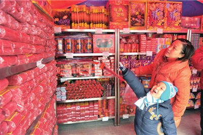 石景山魯谷市場(chǎng)門前的煙花爆竹攤點(diǎn)內(nèi),一位母親帶著孩子在選購(gòu)煙花爆竹。 (記者 胡雪柏?cái)z)