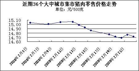 國家發改委網站消息稱,據國家發展改革委價格監測中心監測,上周(2008.2.18-2008.2.22,下同)全國36個大中城市集市豬肉(精瘦肉)平均零售價格每500克為14.73元,比前一周(2008.2.12-2008.2.15,下同)下降1.54%。