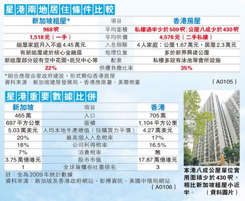 記者采訪與香港同樣地少人多的新加坡。約40年前,香港和新加坡同時(shí)起步,大規(guī)模建屋以解決城市居民住房問題;時(shí)至今日,香港的住屋平均面積比起星洲少一半,樓價(jià)卻起碼高出兩三倍,更要住得遠(yuǎn)離市區(qū)。