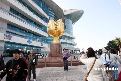 圖為在香港金紫荊廣場游覽的內地游客。 中新社發 洪少葵 攝