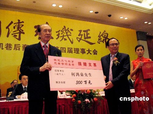 資料圖:圖為2008年11月,港澳知名人士何鴻燊(左)為一項基金捐贈人民幣300萬元。 中新社發 李凌 攝