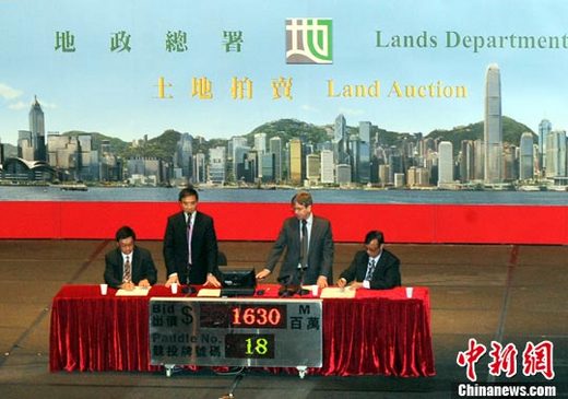 10月12日,香港地政總署在灣仔伊館拍賣一幅位于九龍?zhí)亮x德道3及5號的政府土地,面積約2,808平方米,作私人住宅用途。結(jié)果由華懋以16億3千萬元投得,較8月底賣出的毗鄰義德道1號地皮高出8%,成為九龍區(qū)最貴呎價的“新地王”。 中新社發(fā) 鄧慶樂 攝