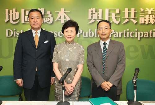 林鄭月娥(中)說,市建局日后供應的單位,將以簡約適中為主。圖左為張震遠、右為羅義坤。圖片來源:大公報