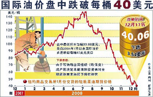 7月23日,油價首次跌破125美元。9月份,美國第四大投資銀行雷曼兄弟公司宣布破產(chǎn),美國第三大投資銀行美林公司被美國銀行收購。一系列消息極大地打擊了投資者對全球經(jīng)濟(jì)的信心,從而引發(fā)油價“跳水”。國際油價一路跌破100美元、50美元、40美元, 12月22日,紐約市場油價跌至每桶33.87美元。自從今年7月中旬以來,國際油價已經(jīng)累計下跌了約73%。