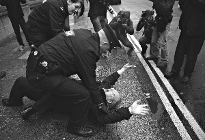11月21日,都柏林,一名抗議者被警察制服。當天,愛爾蘭內閣討論是否向歐盟遞交求援申請,引發抗議。