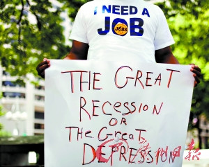 一失業者手持“經濟大衰退或經濟大蕭條”牌子
