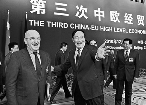 12月21日,在第3次中歐經(jīng)貿(mào)高層對話舉行前,王岐山與歐盟委員會副主席阿爾穆尼亞寒暄