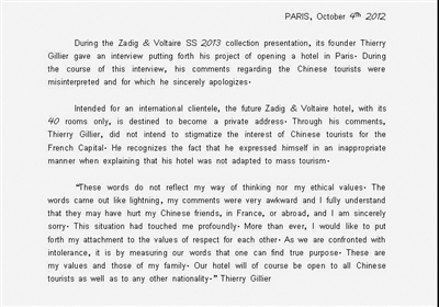 Zadig & Voltaire給本報發(fā)來的蒂里·吉利耶的道歉聲明