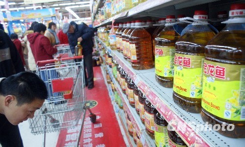 2009年12月6日,蘇州市民在超市選購物品。近日,國內(nèi)食用油開始新一輪漲價(jià)。蘇州各市場(chǎng)食用油貨源充足,市民購貨秩序井然,大多數(shù)蘇州市民表示,食用油調(diào)價(jià)對(duì)他們的生活影響不大。 中新社發(fā) 李俊鋒 攝