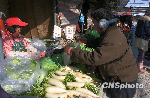 1月4日,北京一個大型菜市場,“堅守崗位”的菜商正與不畏嚴寒的顧客達成交易。受大雪影響,北京菜價普遍上漲。前一日的罕見大雪造成的降溫和交通不便使市民不愿出門買菜,許多菜商也沒有出攤。1月3日,京津冀普降大雪,局地降暴雪。北京天津的降雪量為1951年以來同期最大。根據預測,1月5日北京氣溫或將降至-16℃,為30年來同期最低值。 中新社發 蘇丹 攝