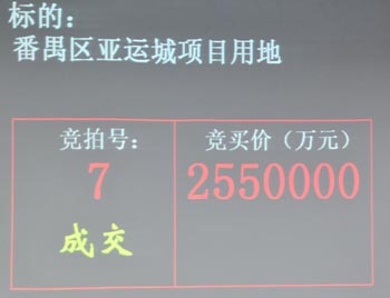在短暫的靜默與期待之后,富力聯合體繼續叫價,一舉打破了業內心理關口,并引發全場鼓掌。在富力聯合體將地價叫到255億元的時候,保利聯合體不再繼續叫價。“255億元第一次……255億元第二次……255億元第三次,成交!”伴隨著一聲響亮的棰聲,亞運城項目在歷時半個鐘頭經過47輪叫價之后被富力聯合體競得。