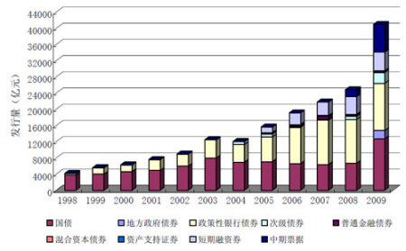 2009年,財政部通過銀行間債券市場發行債券1.5萬億元(包括地方政府債券2000億元),國家開發銀行、中國進出口銀行、中國農業發展銀行在銀行間債券市場發行債券1.2萬億元。2009年,23家商業銀行發行次級債券總計2669億元,發行量為前一年的3.7倍,2家商業銀行發行混合資本債券65億元。普通金融債券發行量穩步增長,金融機構融資渠道進一步拓寬,包括商業銀行、企業集團財務公司等在內的10家金融機構,發行普通金融債券337億元,發行量較前一年增長34.8%。亞洲開發銀行再次發行人民幣債券10億元,至此我國境內國際開發機構人民幣債券已達40億元。非金融企業債務融資工具市場迅速發展,2009年銀行間債券市場共發行短期融資券263只,累計發行面額4612.1億元,中期票據172只,累計發行面額6885億元,同時為支持中小企業發展,創新推出中小非金融企業集合票據,已成功發行12.65億元。2009年,企業通過企業債券與公司債券融資約5000億元。