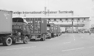 在集裝箱碼頭閘口前看到,運載集裝箱的貨車已經排起了近500米的長龍,而后面還不斷有貨車加入。