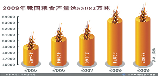 2004年以來,中國糧食連續6年增產,去年糧食總產量達到10616億斤,比2003年增產2002億斤,糧食自給率保持在95%以上。