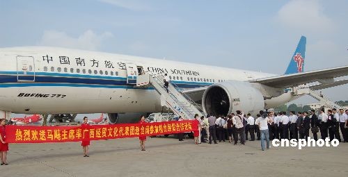 5月21日上午,廣西壯族自治區主席馬飚率領廣西經貿文化代表團乘坐包機從廣西南寧機場起飛,開始飛赴臺灣,廣西由此成為中國大陸各省、自治區、直轄市中第一個由省長級官員率團赴臺進行經貿文化交流的省份,此行也成為海峽兩岸交流史上的新突破。馬飚率團此行赴臺是參加“兩岸產業高峰會議——2009年桂臺經貿合作論壇”,廣西經貿文化代表團人數多達1000余人,這也是大陸赴臺人數最多的參訪團。 中新社發 劉萬強 攝