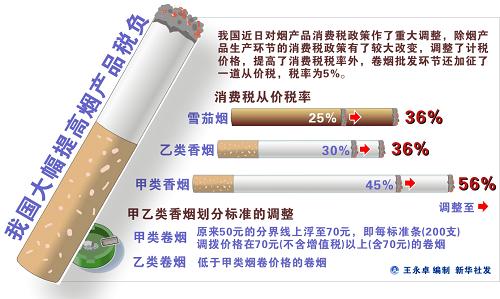 “為了適當增加財政收入,完善煙產品消費稅”,近日,經國務院批準,財政部、國家稅務總局對煙產品消費稅政策作了重大調整,除煙產品生產環節的消費稅政策有了較大改變,提高了消費稅稅率外,卷煙批發環節還加征了一道從價稅,新政策從5月1日起執行。