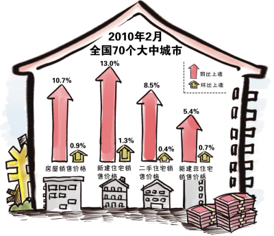 3月10日,國家統計局公布的數據顯示,2月份70個大中城市房屋銷售價格同比上漲10.7%,漲幅比1月份擴大1.2個百分點。但以環比角度分析則略有改觀。2月份70個大中城市房價環比上漲0.9%,與去年12月和今年1月相比,分別收窄了0.6和0.4個百分點。