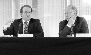 7月23日,歐洲銀行業(yè)監(jiān)管委員會主席喬瓦尼·卡羅西奧(右)和歐洲央行副行長維托爾·康斯坦西奧在英國倫敦出席新聞發(fā)布會。