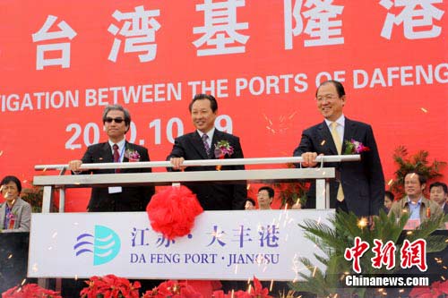 19日上午11時18分,隨著中共鹽城市委書記趙鵬一聲宣布,鹽城地方政府官員與臺灣基隆港物流協會會長共同啟動拉桿,一艘“寶宏8號”貨輪緩緩離岸駛向臺灣基隆港,江蘇大豐港與臺灣基隆港實現首次直航。